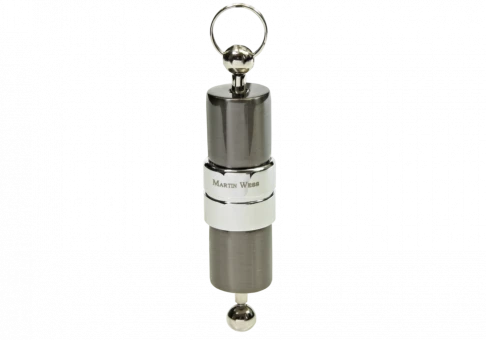 Eloxierter, massiver Bohrer mit zwei Klingen (6mm und 8mm) und Deckblattauswurf. Mit praktischem Anhänger für den Schlüsselbund.